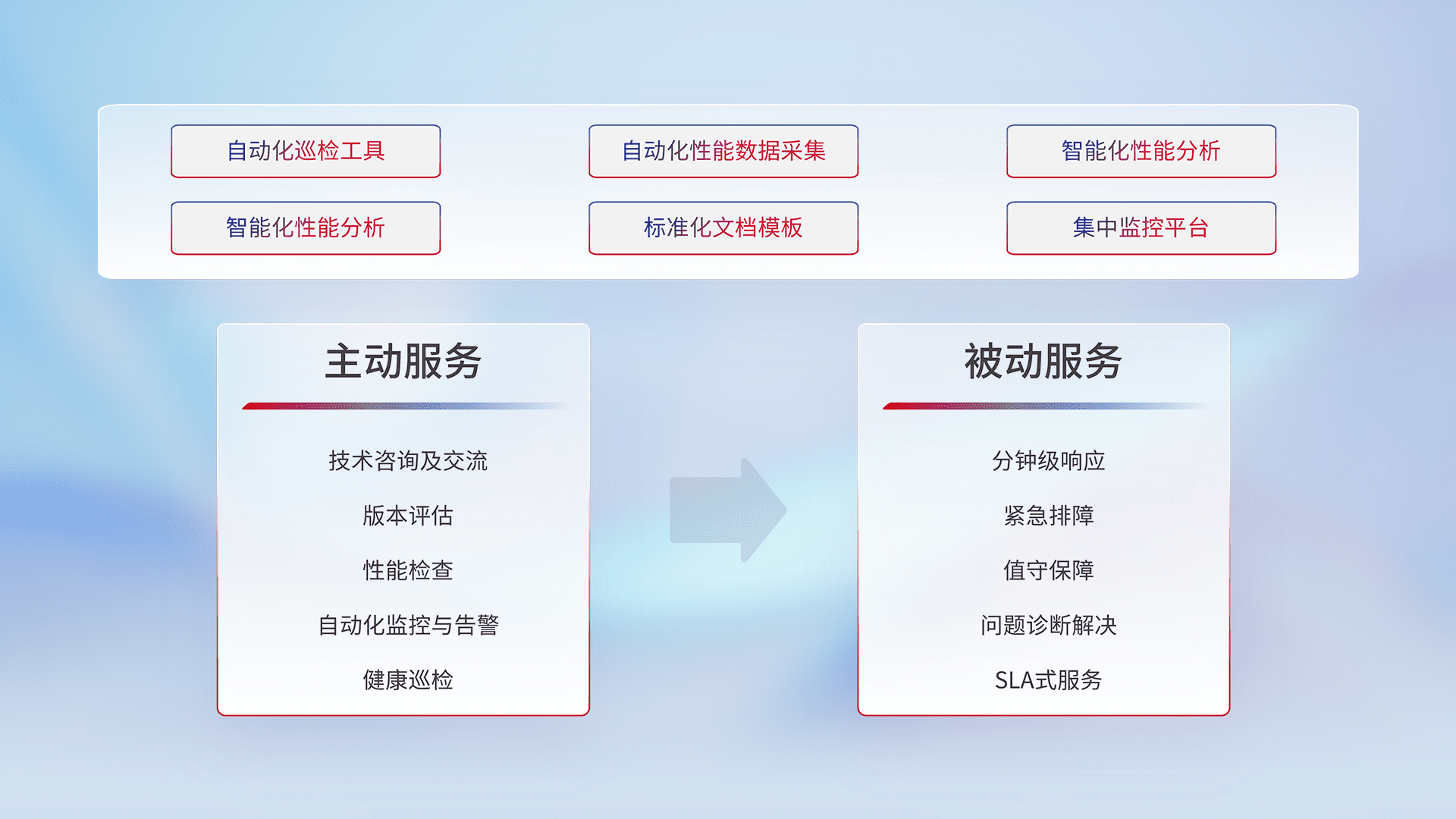 智能化工具和标准化文档,,保障服务质量,,提供主动服务(包含技术咨询、、版本评估、、、性能检查、、、、自动化监控与告警、、、、健康巡检)和被动服务包含(分钟级响应、、紧急排障、、值守保障、、、问题诊断解决、、、、SLA服务)。。。。